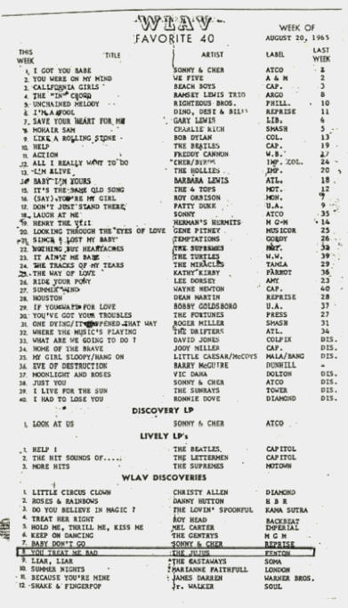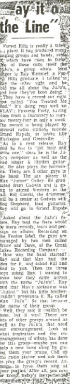 60s: When and where were The JuJus formed? RS: The JuJus were formed in 1964. Originally there was Max “Junior” Colley on sax, Bill Gorski on drums, and me on guitar. We later added Ray Hummel on lead vocal, harmonica, and rhythm guitar, and I switched to bass. After Ray left we added Rick Stevens on guitar on February 12, 1966. Max left, and for another short time we had a singer named Brett Wells. Then Gorski went to Uncle Sam and Brett went on to golf. That pretty much left Rick and me, so we added Ronn Burke for vocals and guitar, and Ron Homrich on drums. Then, in '67, I went to Uncle Sam and the band’s history was lost.