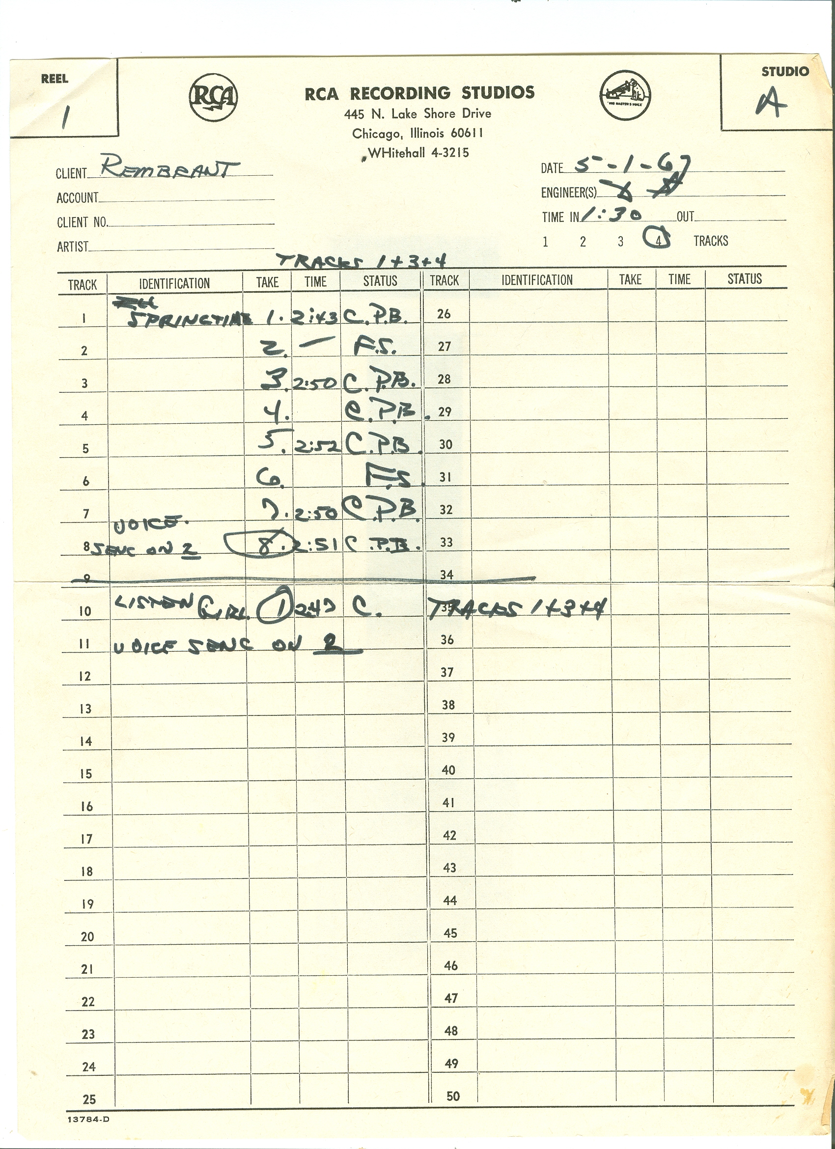 Five hundred copies of “I Live In The Springtime” were pressed and quickly rejected because Reggie found out that the drum track was omitted. He had supplied RCA with a stereo mix-down tape, but apparently the person mastering it patched only one of the two tracks thru instead of collapsing them both into one mono track. A few of the drum-less singles leaked out to the public. One would even end up in 1998 on the Rhino Nuggets Box Set.